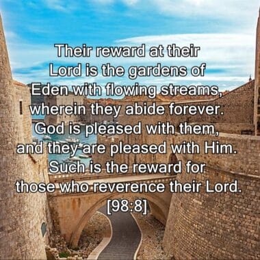 [2:25] Give good news to those who believe and lead a righteous life that they will have gardens with flowing streams. When provided with a provision of fruits therein, they will say, “This is what was provided for us previously.” Thus, they are given allegorical descriptions. They will have pure spouses therein, and they abide therein forever.